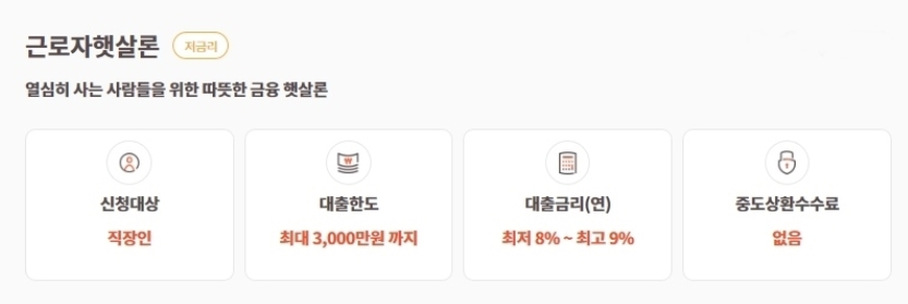 사업자가 필요한 정부지원 대출상품이 미소금융 대출상품이었다면, 근로자/직장인을 대상으로 한 정부지원 대출상품은 단연 '햇살론'이 최고 입니다. 최고 3천만원까지 금리 8~9%에 대출 가능합니다. 사대보험 미가입 사업장에 다니는 직장인도 대출 가능합니다. 신용등급 6등급 이하도 대출 가능합니다.