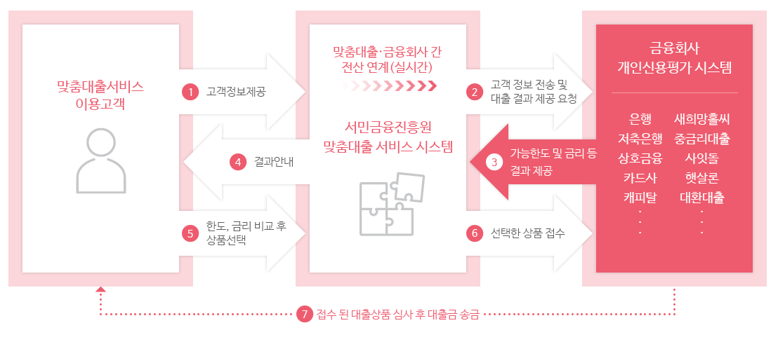 대출을 알아보시는 분들은 다들 아시겠지만 시중에는 수많은 대출상품이 있고, 그것도 은행별로 있어 어떤 상품이 최고로 좋은지 비교하기란 쉽지 않습니다. 최대한 많은 돈을 최저금리로 대출받으면 최고일 것입니다. 맞춤대출이란 고객의 정보를 토대로 금융회사 개인신용평가시스템에 조회하여 한도, 금리를 비교하여 대출상품을 선택하는데 도움을 드리는 일종의 대출비교시스템(대출정보종합플랫폼)입니다.