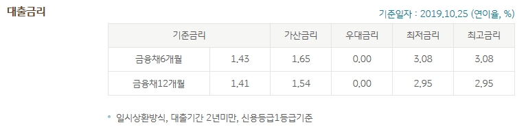 금리는 3% 전후입니다. 신용등급 1등급, 대출기간 2년 미만, 일시상환시 3% 정도의 금리를 받으실 수 있습니다. 본 상품은 중도상환수수료가 없습니다.