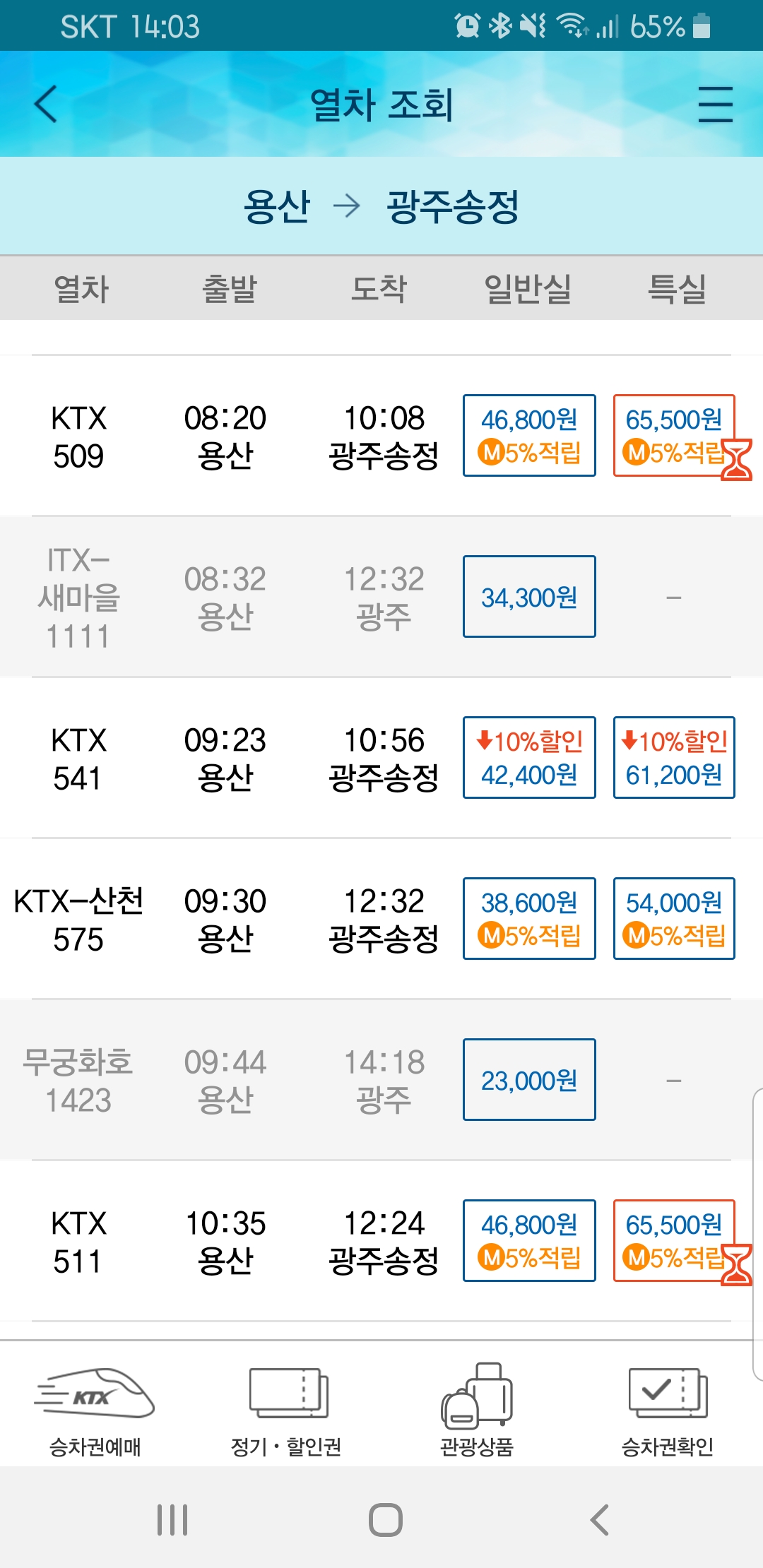 ktx를 타면 빠르고 정확한 도착시간을 확보할 수 있다는 장점이 있습니다. 행신에서 광주까지 2시간 남짓이면 갈수 있습니다. 송정리역에서 도착해서 지하철을 타고 광주로 들어오기도 편합니다. 하지만 예매하지 않으면 좌석을 잡기가 참 어려워요. 특히나 주말에는 만석입니다. 비싼 요금도 단점입니다. 주말 기준 48,000원이라는 부담스러운 운임비는 단점입니다. 그리고 행신역에서는 광주로 내려가는 기차가 하루에 2회 뿐입니다. 시간만 맞으면 좋은데, 내려가는 시간을 기차시간과 맞출 수 있으면 좋은데 그게 아니라면 ktx를 타고 광주 가는 건 어렵습니다. 행신 ktx의 대안은 용산역에서 ktx를 타는 것입니다. 운정역-용산역까지는 약 50분 가량이 소요됩니다. 출근시간만 빼면 용산 가는 전철을 타고 용산에서 KTX를 타면 행신에서의 배차시간을 맞출 필요 없이 케이티엑스를 이용하실 수 있습니다. 출근시간대에는 파주에서 서울로 출퇴근하는 직장인들로 전철이 콩나물시루입니다.