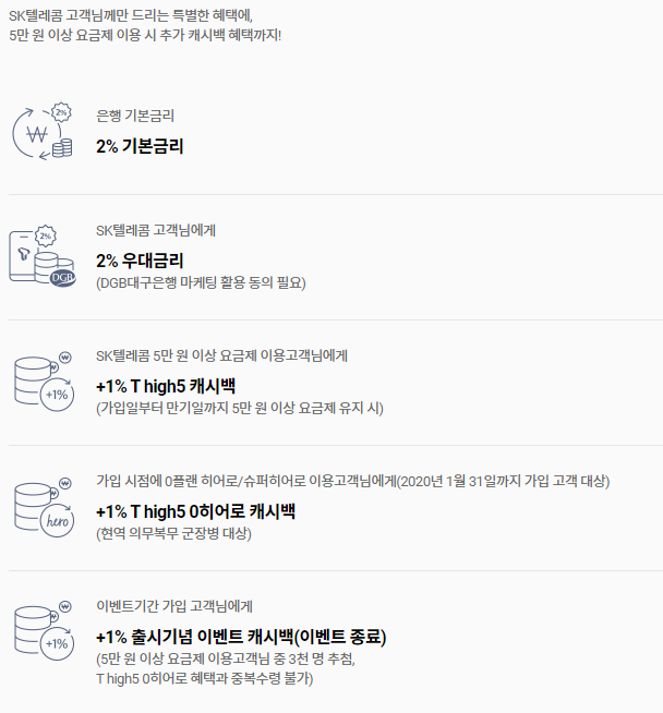 그리고 SK텔레콤 고객은 2%의 우대금리를 받을 수 있어요. 단, 대구은행 마케팅 활용 동의가 필요합니다.