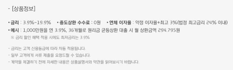 대출한도는 최저 300만원에서 최고 5천만원까지 가능합니다. 금리는 3.9~19.9%까지입니다. 금리 및 대출한도는 고객의 신용등급별로 차이가 납니다. 별도의 대출수수료는 없으며 근저당설정이나 해지비용도 없습니다. 연체이자율은 약정이자율에서 최고 3%까지 가산됩니다. 대출기간은 최장 48개월(4년)이며 상환방법은 원리금을 대출개월수로 나누어 매달 납부하는 방식입니다. 상환기간은 1년, 2년, 3년, 4년 중 선택할 수 있습니다.