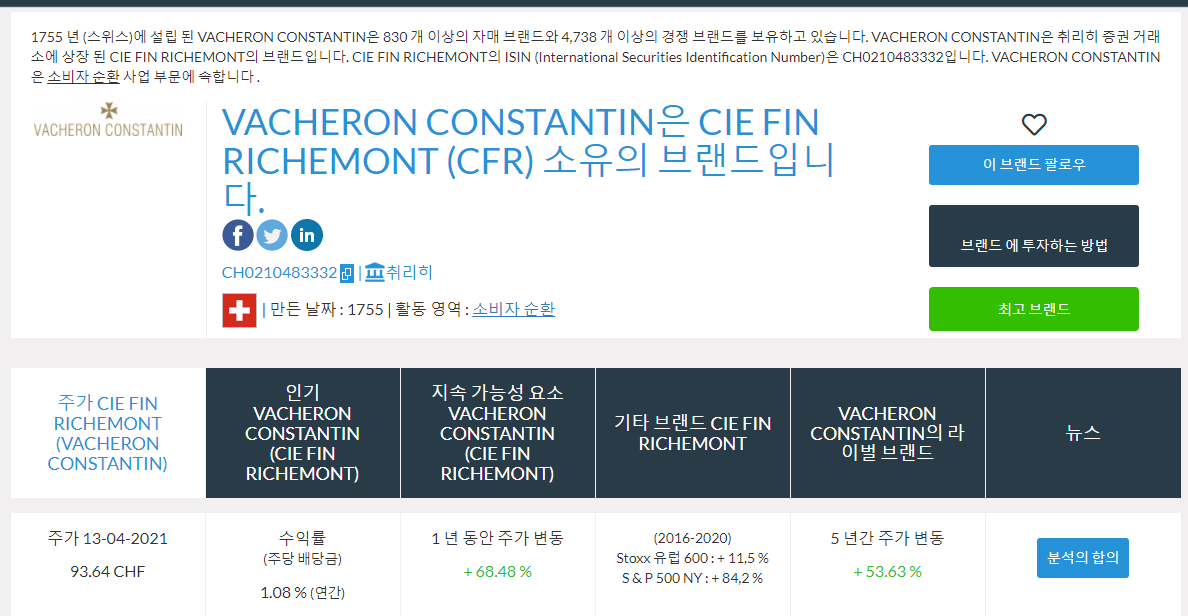 다만, 브랜드를 소유하고 있는 리치몬드라는 기업은 스위스 취리히 증권거래소에 상장되어 그쪽을 통해 실제 주식을 소유하고 있다면 강방천은 바쉐론 콘스탄틴의 주주라는 사실이 맞는 셈입니다. 리치몬드 주가는 최근 1년 동안 68% 올랐습니다.