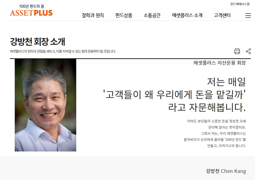 87년 대학졸업 직후 동방증권(현 SK증권)에 입사합니다. 89년 쌍용투자증권, 94년 동부증권 펀드매니저를 거쳐 99년 에셋플러스투자자문사를 설립하게 됩니다. 2008년에 에셋플러스자산운용을 설립하여 현재까지 회장의 위치에서 투자를 이어가고 있습니다.