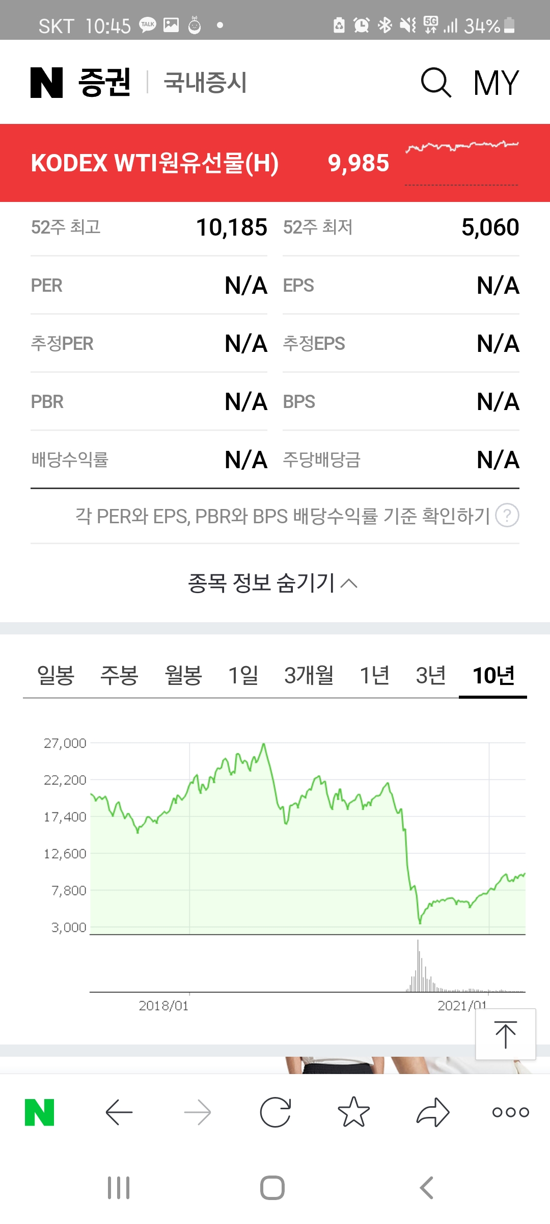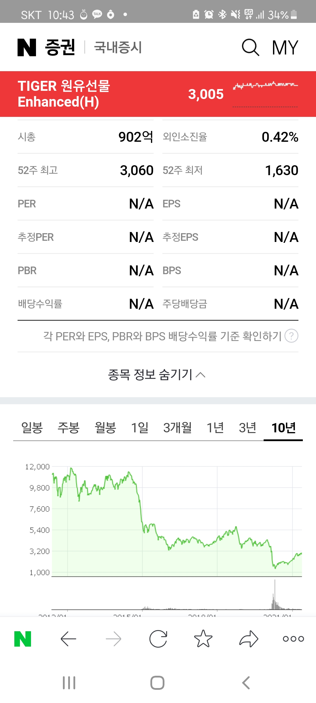 코덱스 원유선물 ETF도 상승중입니다. WTI원유선물에 투자하는 종목입니다. 1년 최고가에 근접해 있지만 이제 시작일 수 있습니다. 2만원대에 놀던 종목이 바닥으로 떨어져서 이정도인데 앞으로 50% 더 가면 15000원입니다.