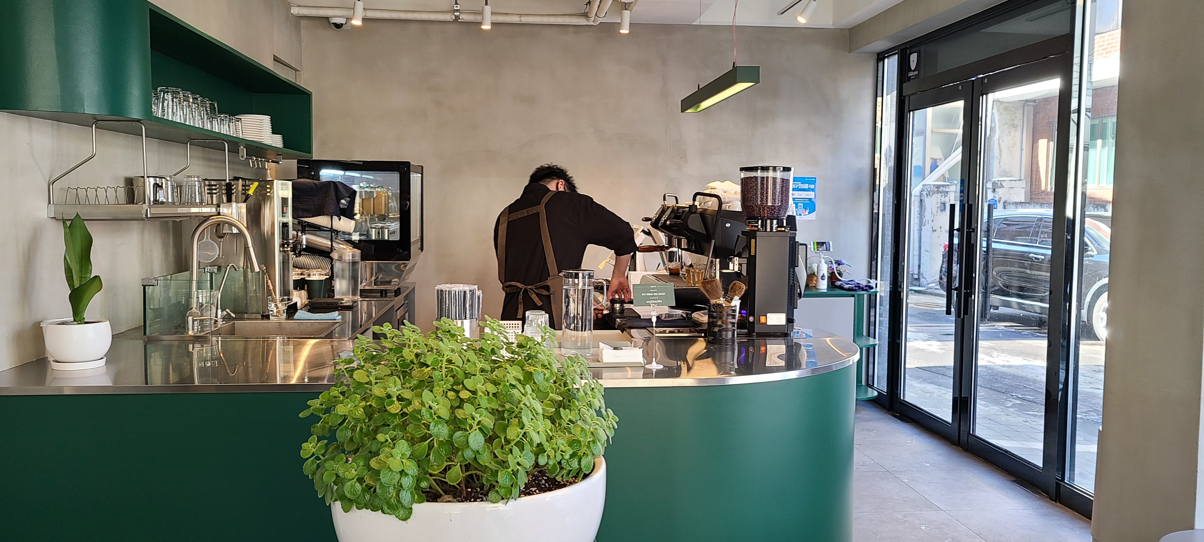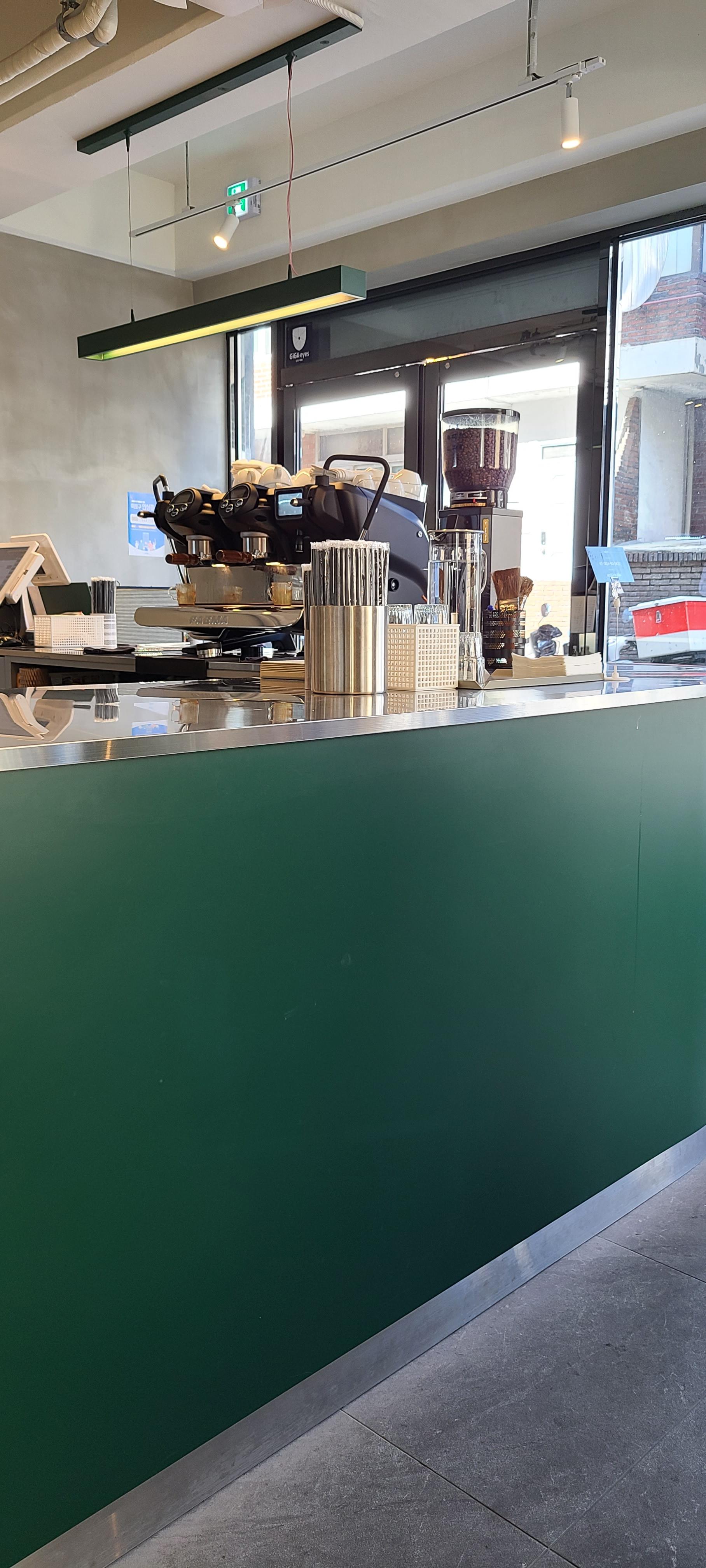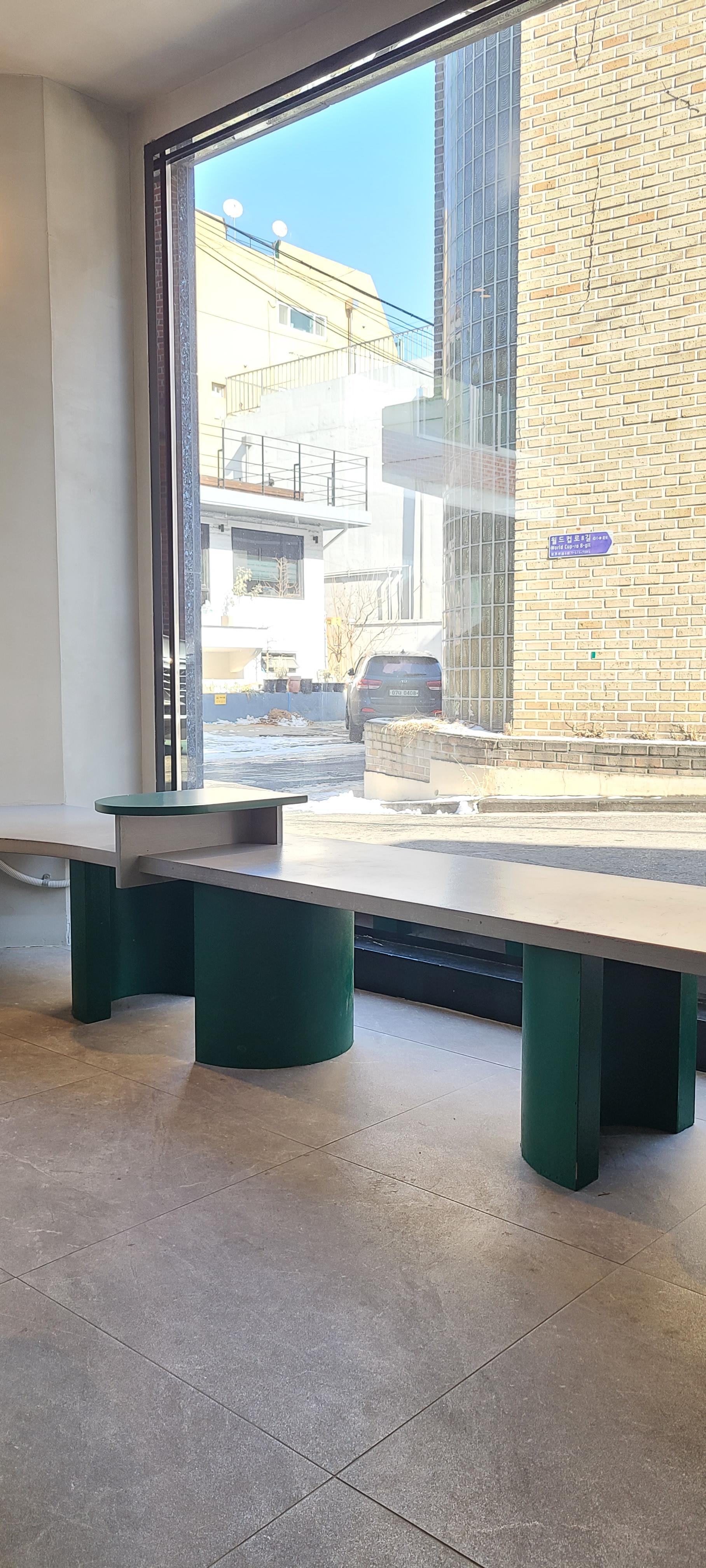 커스텀 커피는 오묘한 녹색을 포인트로 뒀습니다. 코너건물이라 도로를 접한 면은 전면창으로 외부공간과 소통을 적극적으로 하고 있습니다. 이 또한 좁은 공간의 확장의 효과를 느낄 수 있습니다.
