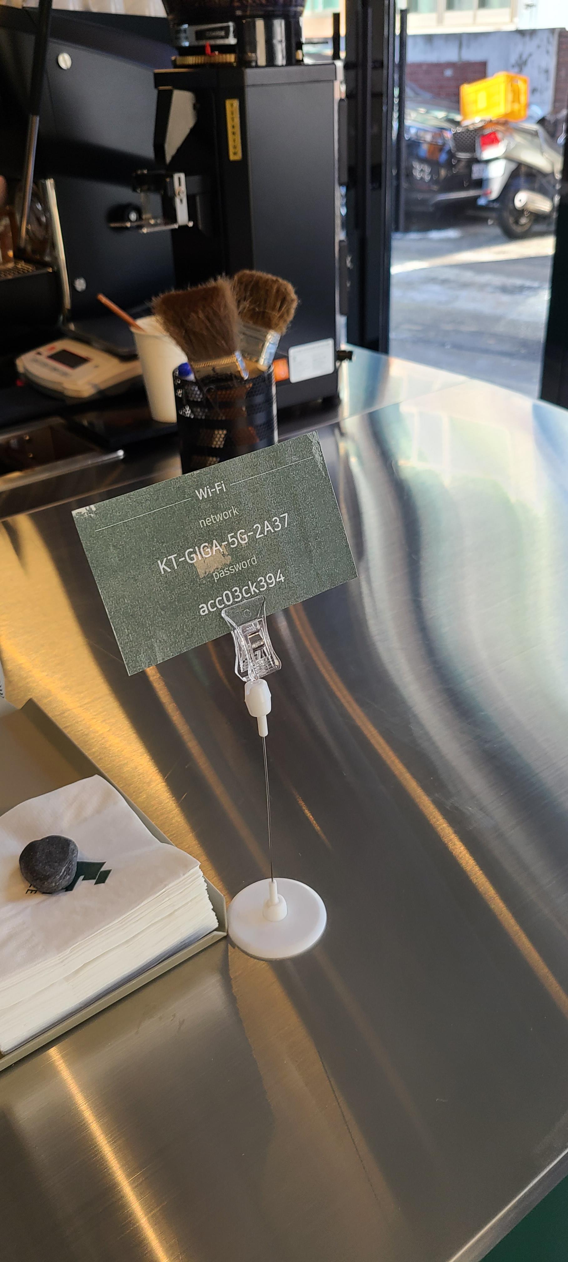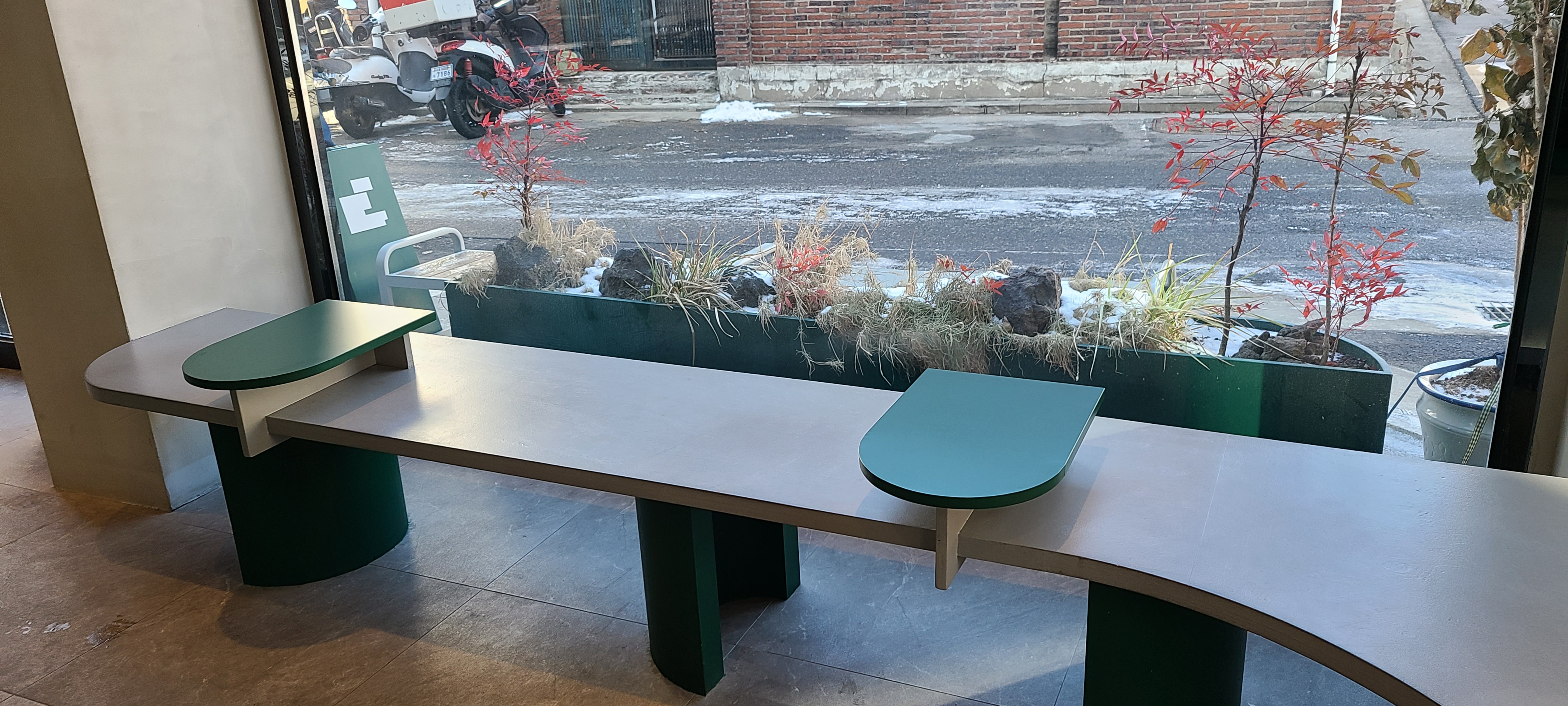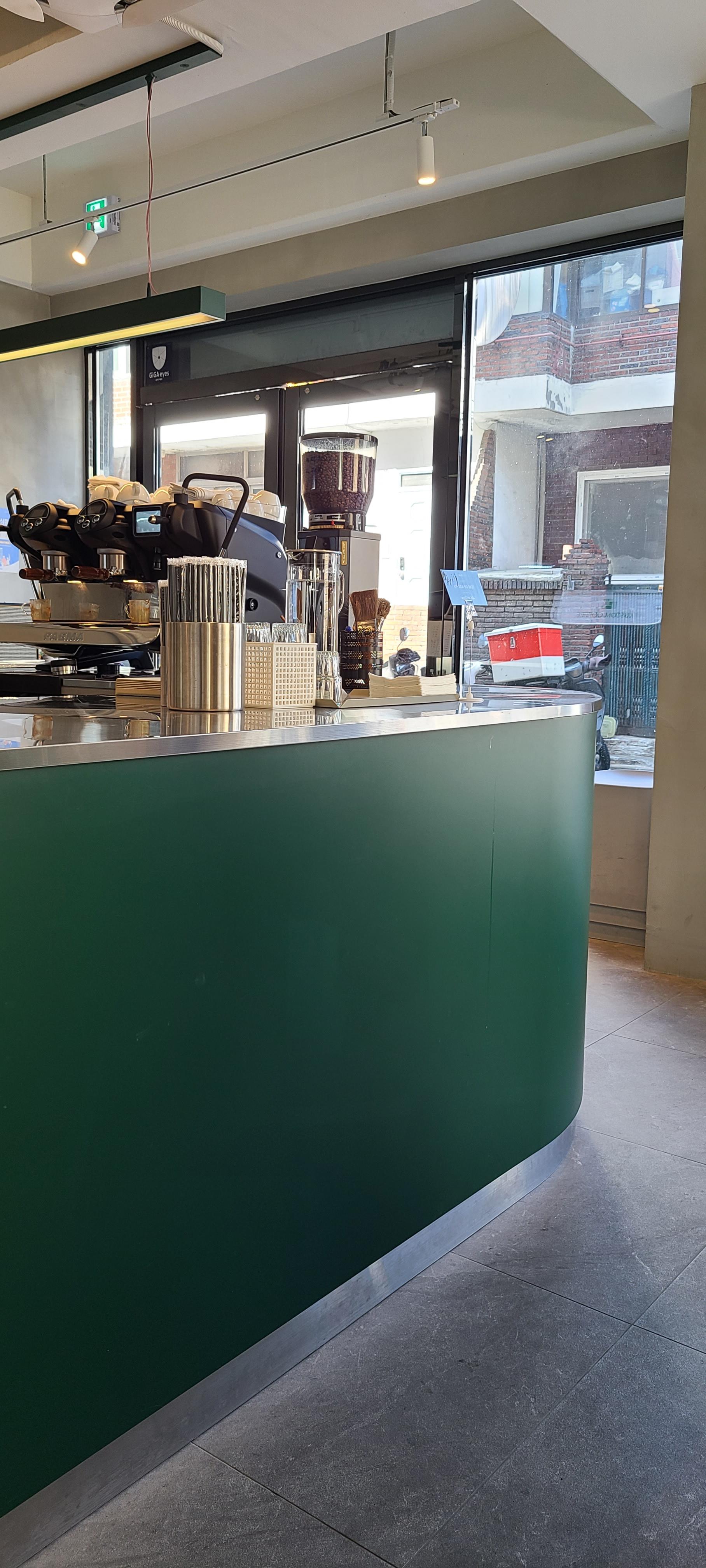 커스텀 커피는 오묘한 녹색을 포인트로 뒀습니다. 코너건물이라 도로를 접한 면은 전면창으로 외부공간과 소통을 적극적으로 하고 있습니다. 이 또한 좁은 공간의 확장의 효과를 느낄 수 있습니다.