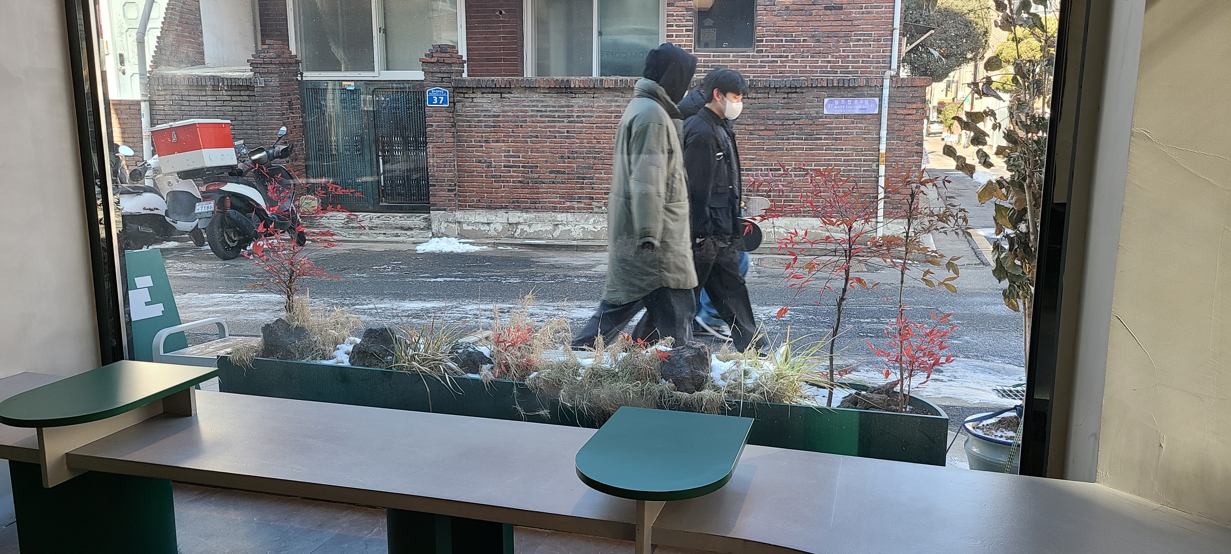 홀이 그리 크지는 않습니다. 의자 및 테이블은 아래와 같습니다. 전면창 밖으로 고즈넉한 서울의 주택가가 보입니다.