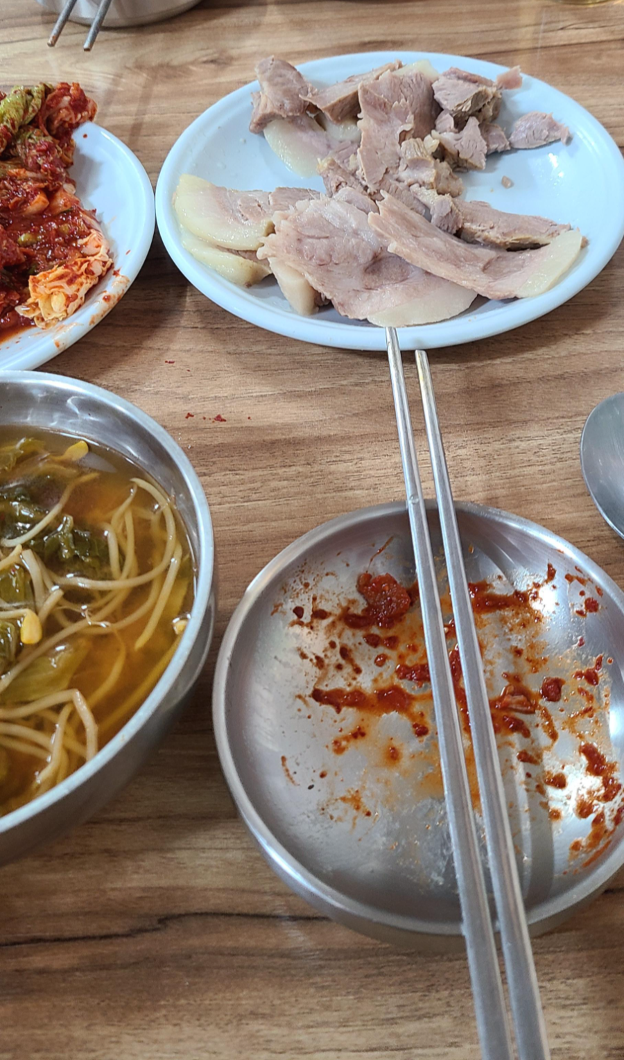 아래 접시에 나오는 수육양이 2인분입니다. 조금 먹은 후인데 양이 많지 않습니다.