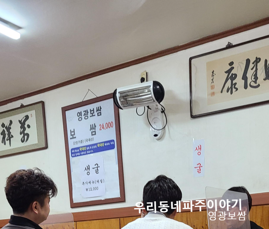 가격은 2인 기준 24,000원입니다. 1인 12000원 수준인데 저녁겸 반주와 함께 먹기에는 그리 비싸지도 않아 보입니다. 그러고 보니 생굴가격인 12000원이니, 부족하다 싶으면 보쌈을 더 주문해도 될듯 싶습니다. 성인남성 기준으로 2명 이인분 을 주문하면 양에 차지 않을 겁니다. 주고객층은 중년의 남성들입니다.