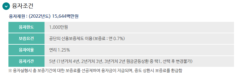 본 대출은 예산한도가 있어 바로 대출이 가능한지 확인이 필요합니다. 대출한도는 1,000만원이며, 대출이율은 1.25%로 매우 낮습니다. 대출기간은 최대 5년입니다. 거치기간(이자만 내는 기간)은 최대 3년까지 설정할 수 있습니다. 복지공단이 대출을 실행해 주는 은행에 보증을 서는 구조여서 보증료가 발생하며, 보증료 연0.7%를 대출자가 부담해야 합니다.