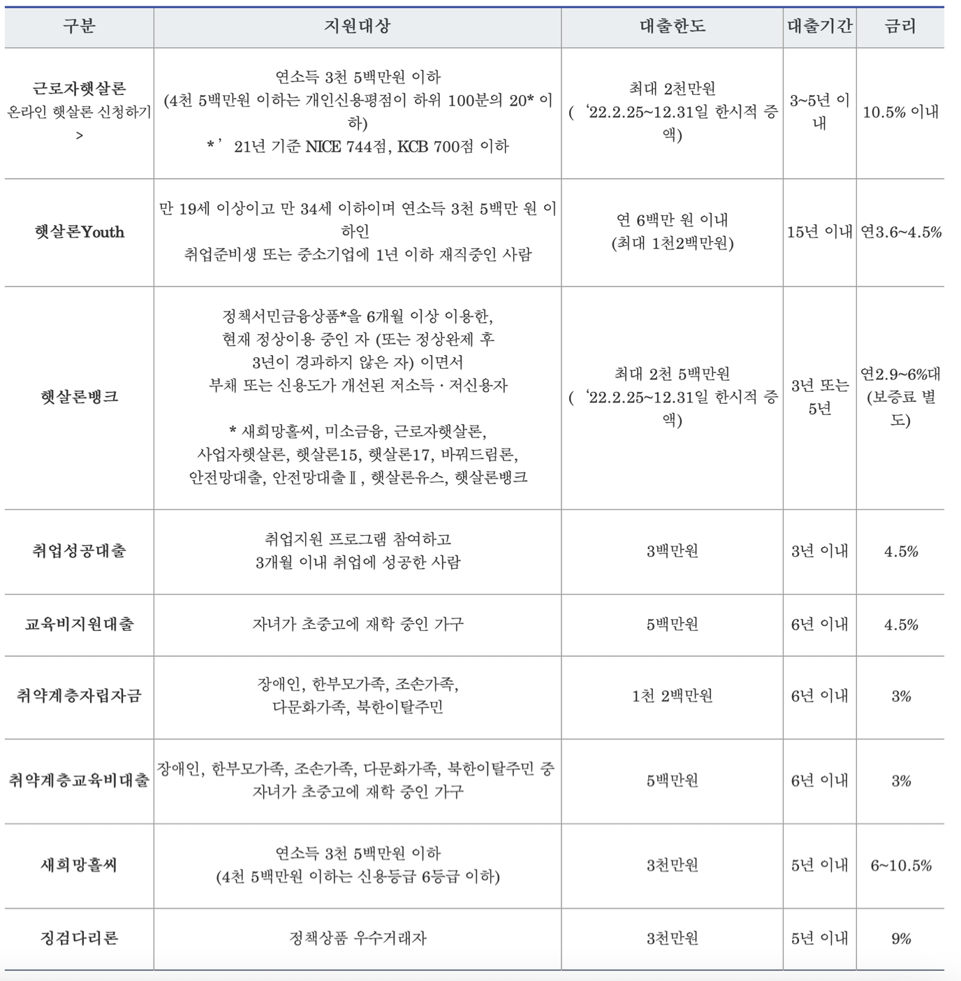정부지원대출 햇살론뱅크 자격조건, 금리한도(저신용자 정책자금대출)