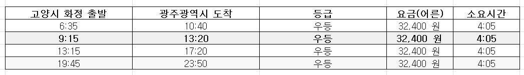 아래는 고양시에서 출발하는 버스편의 시간표 및 요금입니다.