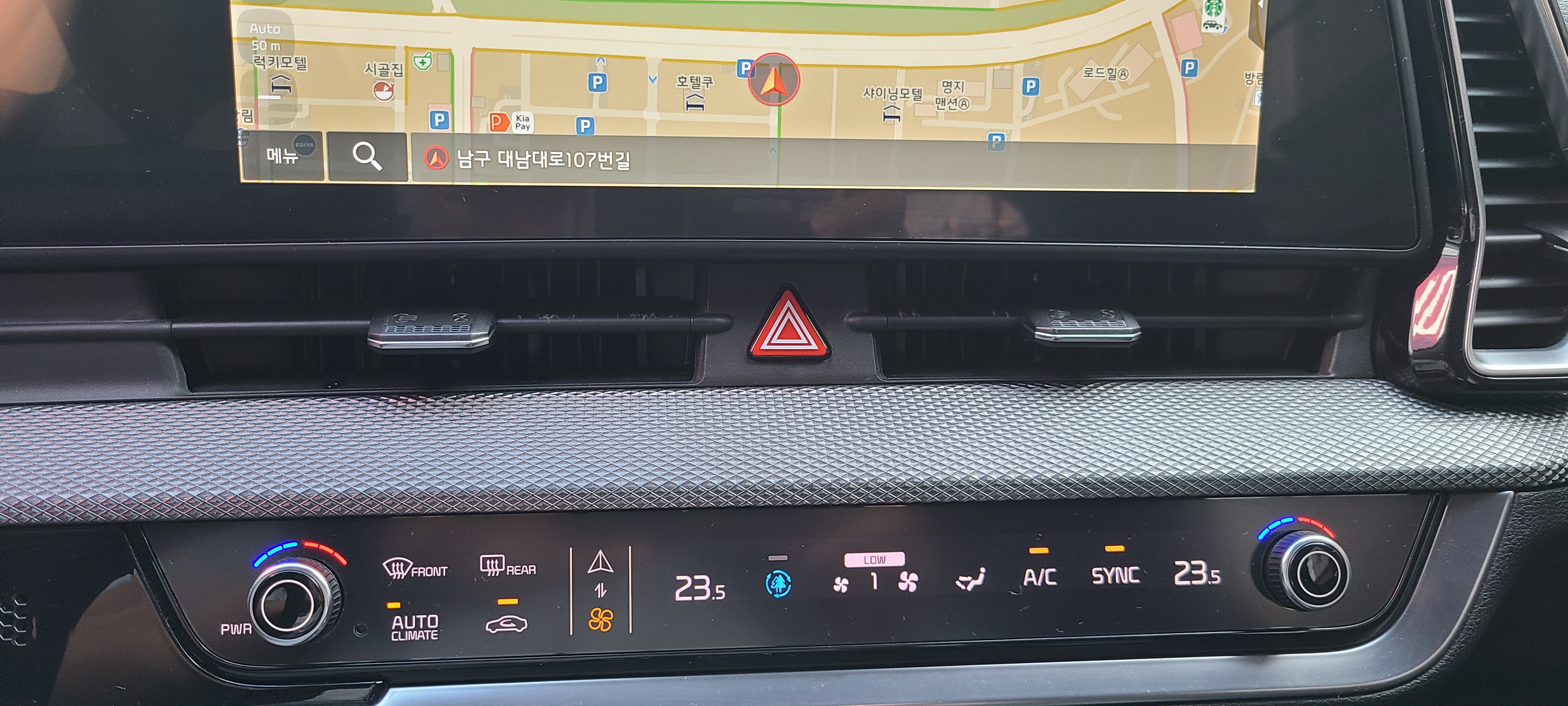 이번 스포티지의 가장 아쉬운 부분은 래 컨트롤 디스플레이입니다. 디자인 상으로는 훌륭한 편이지만 실제 에어컨 조작과 멀티미디어 조작패널을 스위치해서 사용하기 때문에 불편했습니다. 버튼을 한번 누르면 공조장치 조작, 다시 한번 더 누르면 멀티미디어 조작패널이 나타납니다. 바로 컨트럴할 수 없고 버튼을 한번 변경해야 한다는 번거로움은 이루 말할 수 없는 불편함이었습니다.