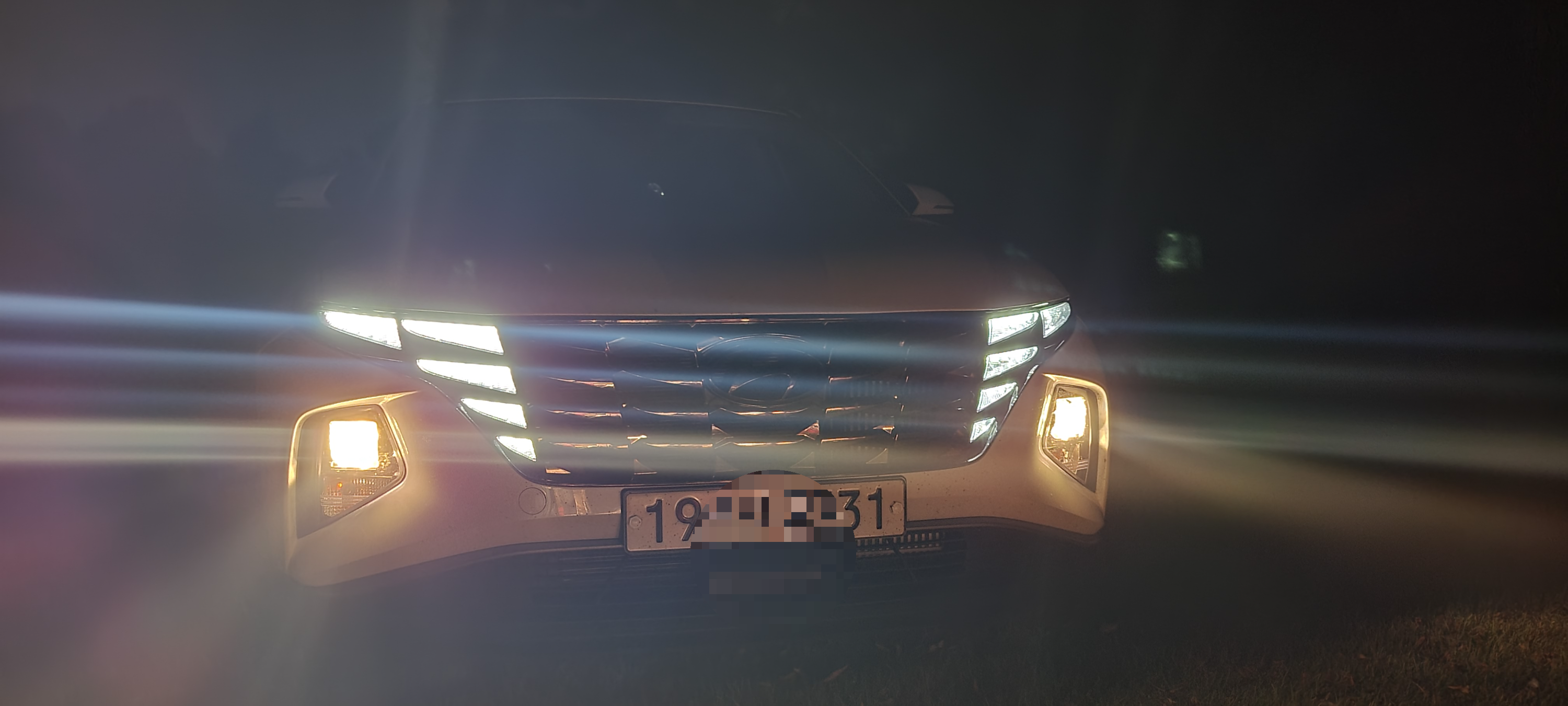 야간 전조등의 모습은 날개와 같은 모습이 인상적입니다. 안개등의 색상이 HID가 아니라서 주황색으로 보입니다.