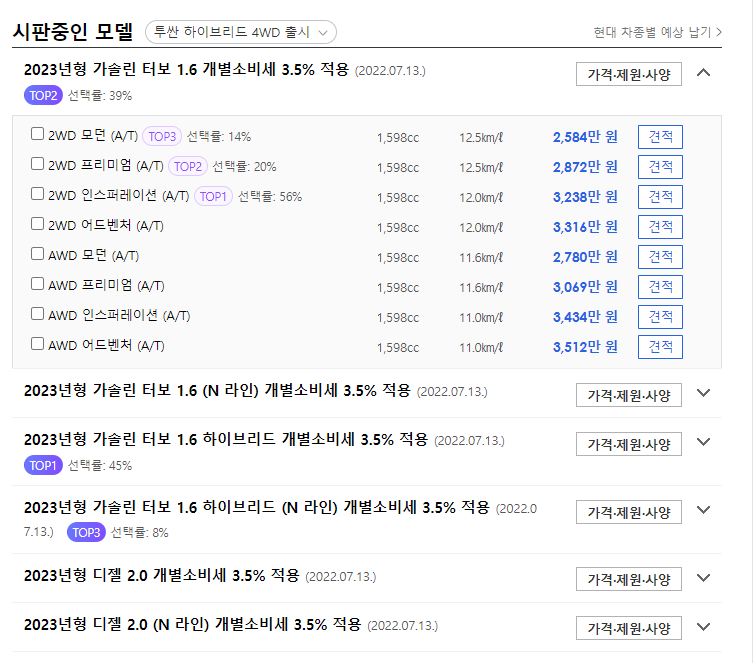 요즘 경유값이 많이 올라서 가솔린 모델이 인기가 좋을 듯 합니다.