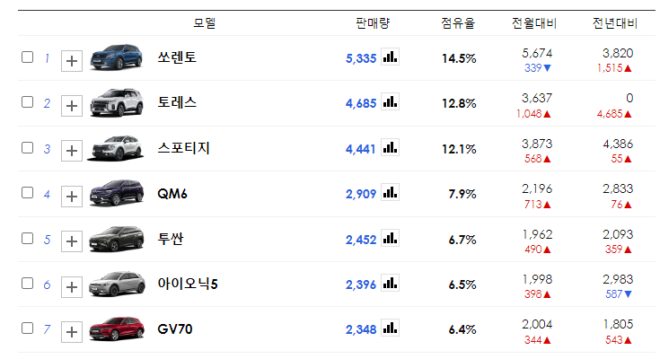 국산 SUV 모델 중에서 QM3 다음의 판매량을 보이고 있습니다. 개인적으로 인기절정의 토레스 보다는 투싼도 구매리스트에 넣어 두시길 추천드립니다.