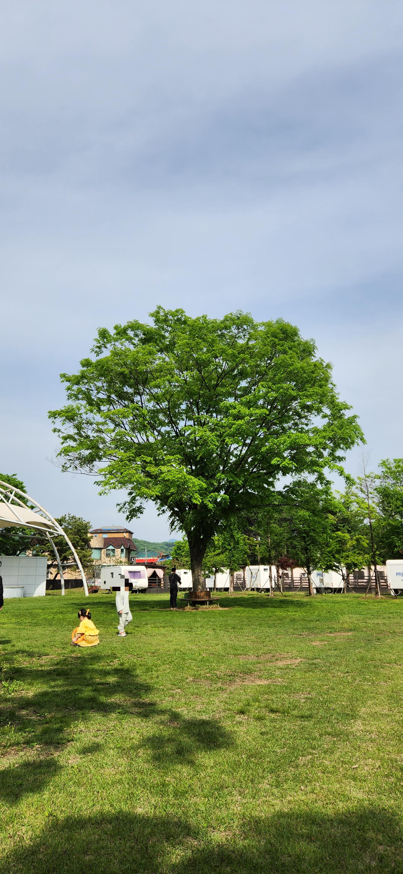 잔디밭 가운데 큰 나무가 울창한 나뭇잎으로 깊은 인상을 줍니다.