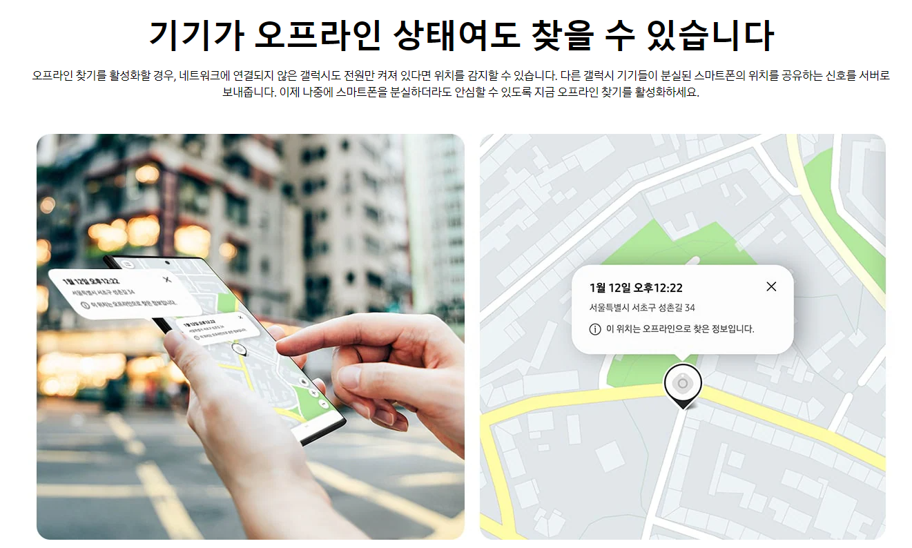 스마트폰 뿐만 아니라 다른 갤럭시 기기들도 찾을 수 있어요. 내 디바이스 찾기 웹사이트를 통해 갤럭시 워치와 이어버드의 위치를 확인하고 기기를 원격으로 제어할 수 있어요. 태블릿이나 스마트폰에서 오프라인 찾기를 활성화하면, 기기를 분실시 위치확인이 가능합니다.