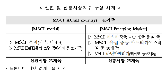이 지수는 전 세계 48개 국가를 선진시장과 신흥시장으로 나누어 세계, 선진시장, 신흥시장 지수를 비롯하여 각 지역, 국가, 산업별 지수 등을 산출하고 발표합니다. 현재 전 세계 48개 국가(선진시장 23개국, 신흥시장 25개국)의 2,000여 개 기업을 대상으로 다양한 형태의 지수를 산출하고 있습니다. 한국은 신흥시장 지수 내에서 상당한 비중을 차지하고 있으며, 국내 기업 중 95개사가 신흥시장 지수에 포함되어 있습니다.