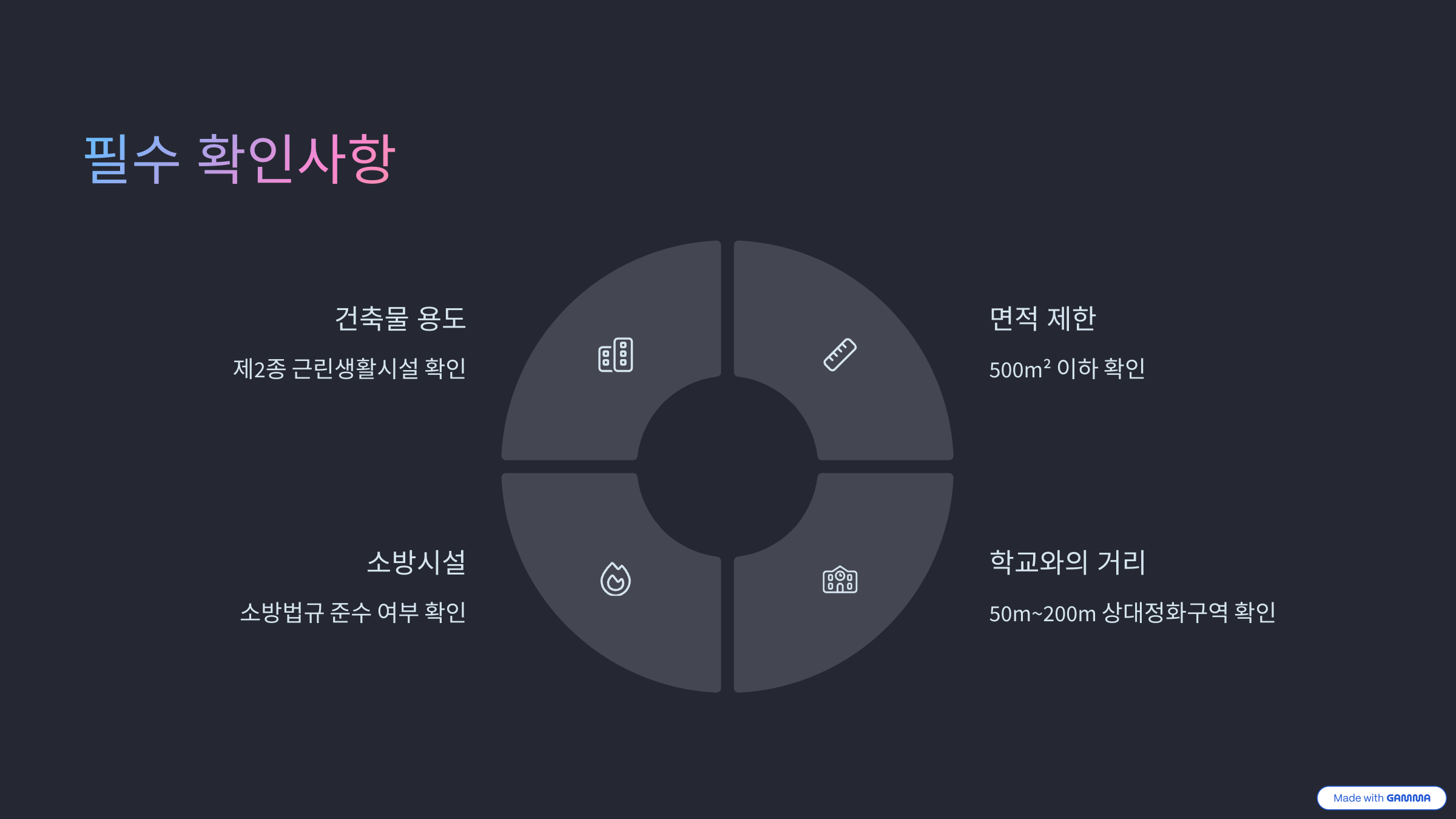 - 건축물의 용도 확인: 건축물대장상 2종 근린생활시설로 등록되어야 합니다.